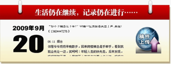 9月19日,記錄“中國一日”活動正式啟動,全媒體采訪中心分頭行動,進行視頻、圖文采訪,網友在論壇、博客、開心公社正式上傳作品,互動評論部提前約請的一大批公民記者也紛紛行動起來。正式審核完手機報后,我安排編輯上手機報讀者短信后臺整理“讀者的一天”。讀著編輯發給我的 “一天”,心中產生了一種平凡的感動。