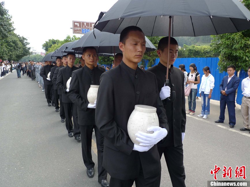 9月13日,從緬甸尋回的19名中國遠征軍將士遺骸,分別沿著瑞麗畹町和騰沖猴橋口岸,回到他們為之獻身的祖國,并將于14日歸葬在騰沖國殤墓園中國遠征軍陣亡將士墓中。圖為工作人員護送遠征軍骨灰進入國殤墓園。
