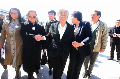 今天上午,周海嬰的夫人馬新云(左四)在眾人的攙扶下,步入靈堂 攝/記者 黑客 付丁