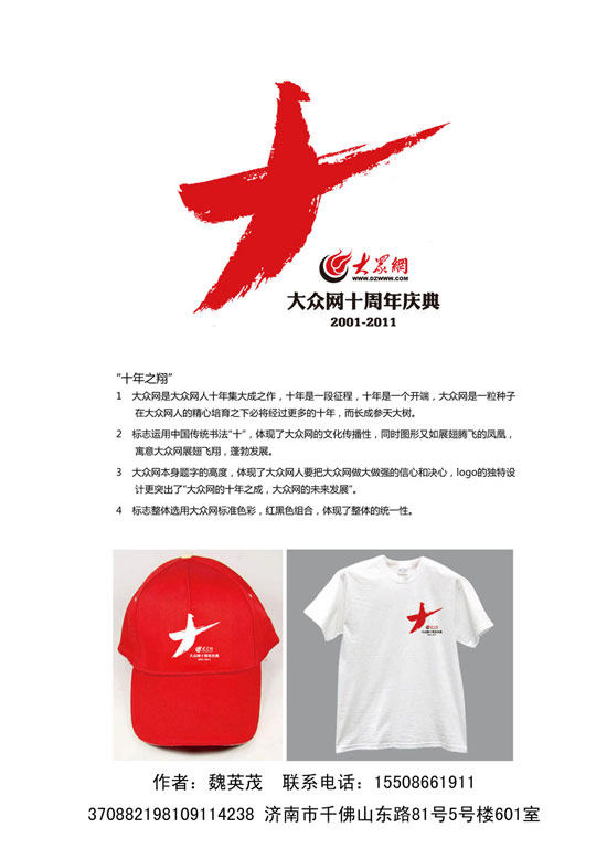 標(biāo)志運(yùn)用中國傳統(tǒng)書法“十”,體現(xiàn)了大眾網(wǎng)的文化傳播性,同時(shí)圖形又如展翅騰飛的鳳凰,寓意大眾網(wǎng)展翅飛翔,蓬勃發(fā)展。