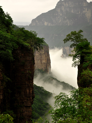 從河南新鄉(xiāng)輝縣市縣城向西北的南太行深處進(jìn)發(fā),沿途都是迷人的風(fēng)景——回龍、關(guān)山,還有著名的八里溝。不過,正如《大河報(bào)》首席記者于茂世所言,“最險(xiǎn)、最美的風(fēng)景,則在路的盡頭,在最后出現(xiàn)的九蓮山上”,這正應(yīng)了古人那句名詩(shī),“無限風(fēng)光在險(xiǎn)峰”。