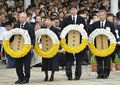 當(dāng)天,包括代表美國首次出席的美國駐日大使魯斯在內(nèi)的42個國家派代表出席了儀式,在當(dāng)年投下原子彈的上午11點02分起立默哀。此外,下令投下原子彈的美國前總統(tǒng)杜魯門之孫克里夫頓?杜魯門?丹尼爾也繼廣島和平儀式之后到場出席。