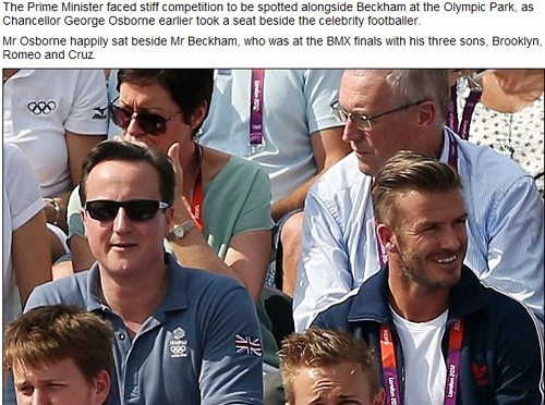 值得一提的是,包括英國首相卡梅倫(David Cameron)和財政大臣喬治 奧斯本在內的一些政界名人身影經常出現在貝克漢姆身邊的座位上,有“搶鏡頭”之嫌。