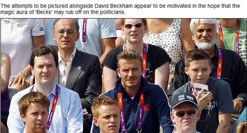 [提要] 據英國《每日郵報》8月10日報道,2012年倫敦奧運會期間,英國足球明星貝克漢姆(David Beckham)成為奧運觀眾席上最引人關注的名人之一。值得一提的是,包括英國首相卡梅倫(David Cameron)和財政大臣喬治 奧斯本在內的一些政界名人身影經常出現在貝克漢姆身邊的座位上,有“搶鏡頭”之嫌。