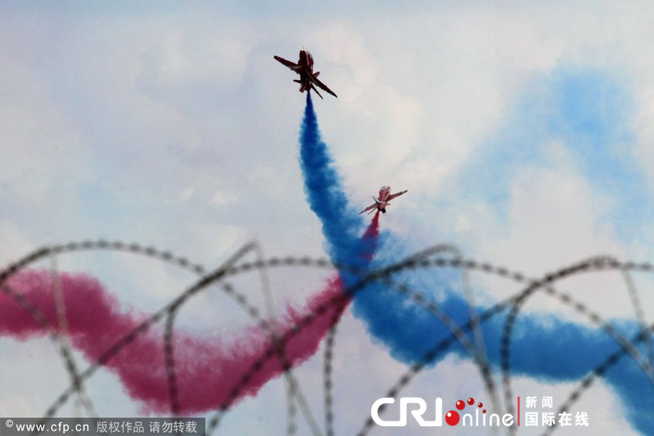 國(guó)際在線(xiàn)消息:當(dāng)?shù)貢r(shí)間2012年8月12日,在俄羅斯茹科夫斯基,俄羅斯Su-27、Su-25和Mig-29戰(zhàn)機(jī)在空中表演,擺成數(shù)字100的樣子。意大利空軍飛行表演隊(duì)也進(jìn)行了精彩表演。俄羅斯慶祝空軍成立100周年。