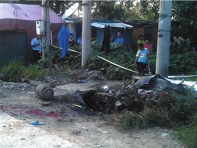 [提要] 昨天(12日)下午3點半左右,在朝陽區(qū)來廣營鄉(xiāng)北湖渠村內(nèi),一名六旬老太在自家門前的草叢邊被炸身亡。現(xiàn)場的民警稱,初步懷疑是因改裝煤氣罐,自制氫氣所致,具體爆炸原因還需調(diào)查。
