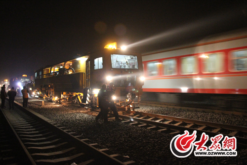 [提要] 1月13日晚上8點(diǎn)28分,淄博市臨淄火車站前,漆黑、安靜。大眾網(wǎng)記者跟隨濟(jì)南鐵路局工務(wù)機(jī)械段的20多名維修工走上月臺(tái)。此時(shí),鐵軌上,一組50多米長(zhǎng)的維修機(jī)車正靜臥在膠濟(jì)鐵路客運(yùn)專線上,等待我們的到來(lái)。