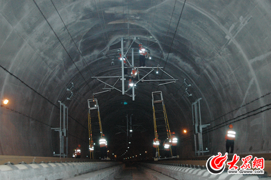趁著開“天窗”的時(shí)間,濟(jì)南供電段的接觸網(wǎng)工檢測隧道內(nèi)的線路狀況。