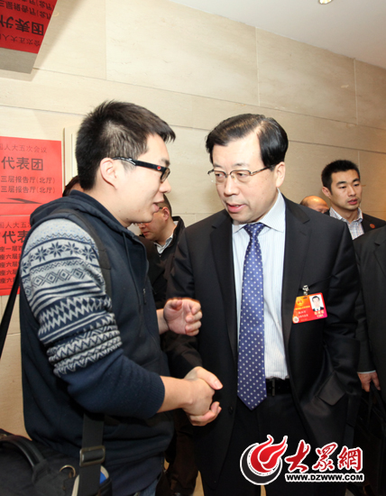 全國人大代表、煙臺市委書記、市人大常委會主任張江。ㄓ遥┙邮艽蟊娋W記者采訪。