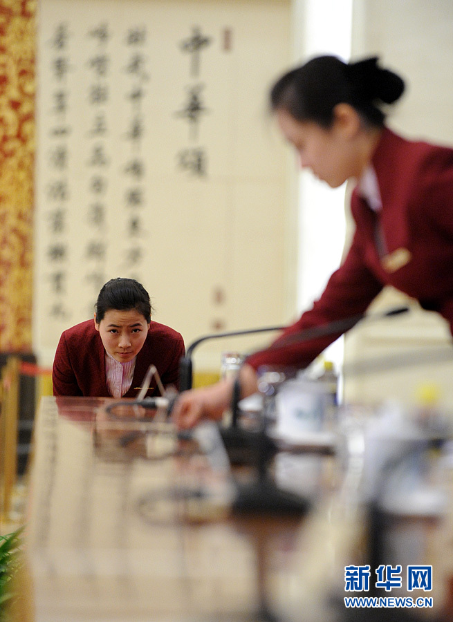 十一屆全國人大五次會議和全國政協十一屆五次會議分別于3月5日和3月3日在北京開幕。在會議進行期間,有一批女性身影,她們,因為服務兩會、因為報道兩會而工作著,美麗著。圖為3月2日15時,全國政協十一屆五次會議新聞發布會現場,兩名女性服務人員正在布置會場。新華網 陳競超 攝
