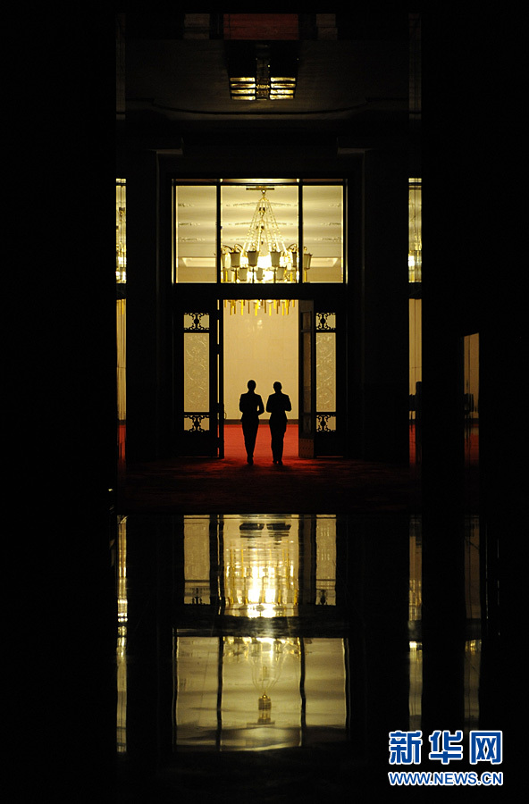 十一屆全國人大五次會議和全國政協十一屆五次會議將分別于3月5日和3月3日在北京開幕。圖為兩名服務人員走過大會堂東大廳。新華網 陳競超 攝