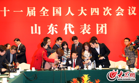 [提要] 山東團開放日上,全國人大代表、山東省委副書記、省長姜大明對大眾網(wǎng)記者說:“網(wǎng)友有疑問我們進行回答,去年你拉出個單子(網(wǎng)友提問),我做了回答,今年你提的早,我已經(jīng)回答完了交給你了。”省長的話音剛落,現(xiàn)場隨即響起一片會意的笑聲。