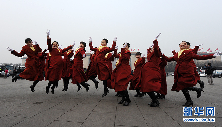 2012年3月5日上午9時(shí),第十一屆全國(guó)人民代表大會(huì)第五次會(huì)議在人民大會(huì)堂開(kāi)幕。圖為開(kāi)幕會(huì)當(dāng)天全國(guó)兩會(huì)住地賓館酒店禮儀小姐天安門(mén)廣場(chǎng)上留影。新華網(wǎng) 陳競(jìng)超 攝