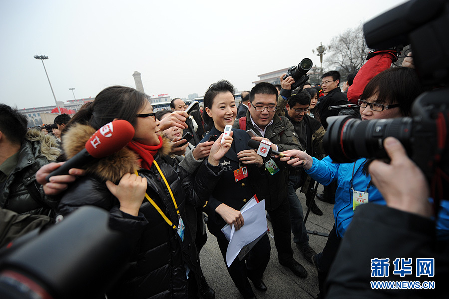2012年3月3日15時,全國政協十一屆五次會議在人民大會堂舉行開幕會。圖為全國政協委員宋祖英遭遇媒體圍堵采訪。新華網 陳競超 攝