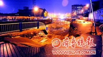 [提要] 8月5日晚,南全福河河堤被沖垮約20米。記者看到,由于水流的沖擊,塌方處不時有土塊落進河水,引發圍觀市民的一聲聲驚呼。省城的這場雨造成花洪路、燕山立交橋西等地積水,廣場東溝水位急劇上漲,廣場東溝黎明壩水面幾乎和河岸齊平,有溢出的危險。
