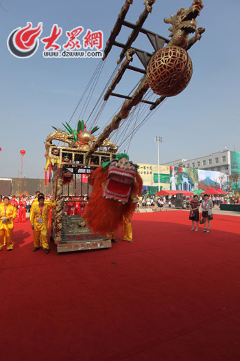 大眾網記者在現場看到,11位藝術家用38條20多米長的纖繩操縱著九只獅子和一個彩球在空中飛舞,演繹了九獅狂歡、獅子銜球的絕技,營造出激情歡樂的喜慶歡樂氣氛。