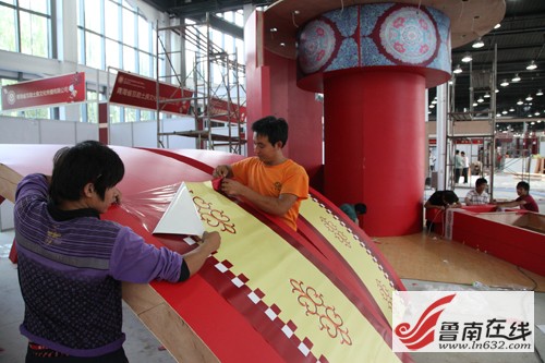 一位正在往“亭子”上貼裝飾帖的女士說,這幾天真的很緊張,因為展位面積大,他們的工作量也非常大,但能來到棗莊展示他們江南的非遺產品,大家干得都很起勁。B展區是山東展廳,共分三層,濟南的“牌坊”、淄博的“瓷窯”均已立起,棗莊的展位還在制作之中,高高的噴繪上,虎頭鞋帽、棗莊泥塑、洛房泥玩具等非常惹眼。威海的浪花形展位已見雛形,年輕的李師傅正帶著幾名工人在工作,他說,大家的展位設計的都很有地方特色,這也是地域文化的體現,為了盡快完工,他們這幾天都沒午休,在工地上簡單吃點就又接著干了。苦點累點也值了,只要制作的展位能為非遺展品增光添彩。