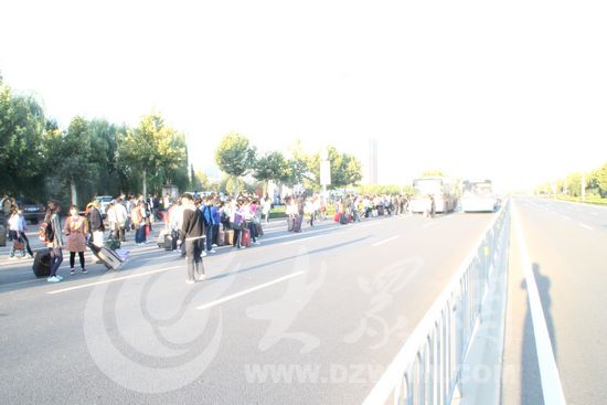 長清大學城山東師范大學站,等車的學生在馬路上排開數十米長。