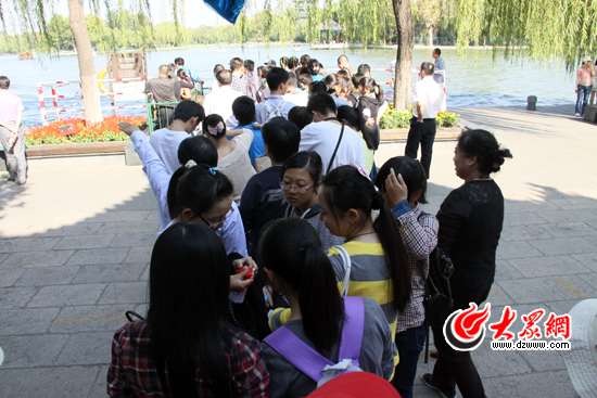 上午9點30分,記者在趵突泉公園的標(biāo)志性景觀趵突泉三股水附近看到,眼前黑壓壓的人群已經(jīng)將三股水圍了個“水泄不通”,“讓一讓,照個相”等聲音不絕于耳。不少游客被擠在后面看不到趵突泉三股水的風(fēng)采,只得將相機高高舉過頭頂,從鏡頭中一睹三股水的芳容!叭藢嵲谔嗔耍贿^也有心理準(zhǔn)備!眮碜匀R蕪市的黃先生說道。他說,自己一家早晨7點就從萊蕪趕到濟南,雖然知道今天人肯定多,不過也愿意來湊個熱鬧。