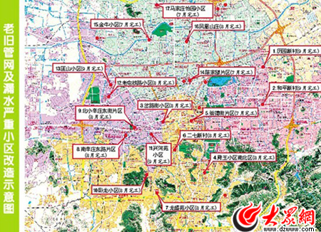 這17個片區包括:和平新村、岔路街小區、舜玉小區南北區、崇德街片區、龍盛苑小區、南辛莊東路片區、北小辛莊東街片區、臥龍小區、興河苑小區、匡山小區、啟盛街片區、陳家樓片區、金牛小區、荷香村片區、西義和莊片區、老屯鐵路小區、馬家莊怡園小區等,改造將累計升級85公里供水管網,工程已于今年4月份全面開工,預計10月份17個片區的管道升級將全部完成。