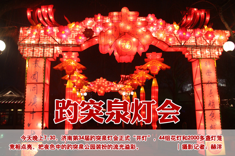 大眾網濟南2月6日訊(記者 赫洋)今天晚上7:30,濟南第34屆趵突泉燈會正式“開燈”,44組花燈和2000多盞燈籠競相點亮,把夜色中的趵突泉公園裝扮的流光溢彩。