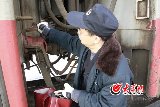 今天下午,當記者來到庫檢車間的時候,一排一排的火車車廂正排放在鐵軌上,穿著制服的工作人員在車上忙上忙下。這時,亓傳赟正在一輛列車上工作,他通過對講機知道記者到來后,馬上從火車上跳下來,雙手在衣服上使勁抹了抹,才握住記者的手表示歡迎。