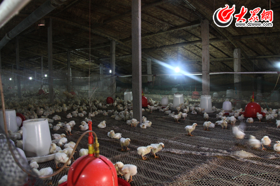 記者們迫不及待的要進棚去看看。因為天氣轉冷,記者穿著厚外套,意想不到的是一走進雞棚,便頓時感到悶熱無比,難以呼吸,只往前走了幾步就不得不退出來喘口氣。李付喜告訴記者,因為現在小雞才9天大,所以生長環境需要高溫,現在雞棚里的溫度在32攝氏度以上。記者脫去外套再次走進雞棚,這才注意到在雞棚門口有一個一人高的大火爐,火爐上的鐵管從天花板上走向雞棚深處。有這么大一個火爐在供熱,難怪走進雞棚像是突然走進了母雞的懷抱。