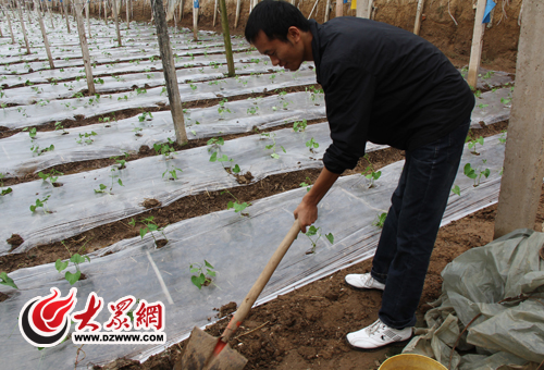 記者學著種植戶,鏟來泥土蓋住保溫膜邊緣