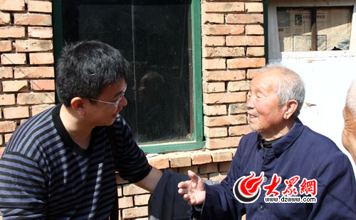 記者尹玉濤與李功祥老人交流。