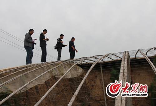 記者們跟隨李新業主任爬上一間溫棚的頂部,李主任向記者介紹起溫棚的結構