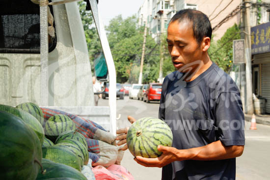 [提要] 在夏季吃上一個涼爽的西瓜既解渴又祛暑,真是美事一樁,而為市民們奉上這美味的瓜農們卻每天要頭頂烈日把西瓜采摘、收好,再連夜運到市區,無論氣溫多高他們都會堅持著把收獲的西瓜賣完。7月2日、3日,記者來到賣瓜農的瓜攤前,親身體驗了一下賣瓜的辛苦。