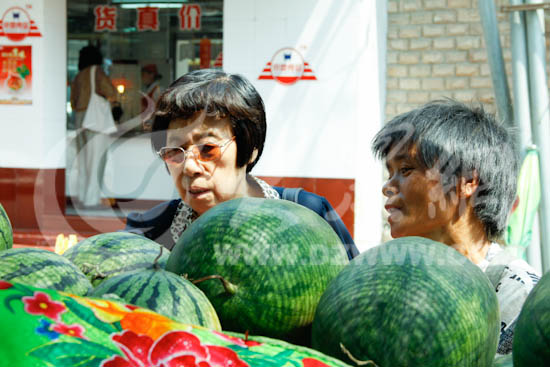 應買瓜人的要求,韓傳連要把西瓜為顧客切好。見習記者 張帆 攝