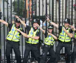 唐寧街10號,警察和護衛也擺出了博爾特的招牌造型,顯然他們都是博爾特的粉絲。(圖)