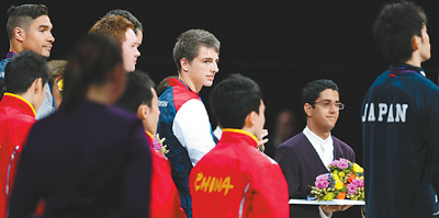 汪大昭:體操男團決賽,日本隊主力內村航平在最后一項鞍馬比賽中出現失誤,得到13.466分,但日本隊教練組馬上提出申訴,經過現場技術臺代表商議之后,通過了這次申訴,將內村航平得分改為14.166分。這樣,日本隊也由之前的第四名變成第二名,而東道主英國隊則退居第三,原本能拿到銅牌的烏克蘭隊成了第四名。