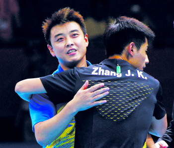 張繼科(右)賽后與隊友王皓擁抱慶祝。□新華社發
