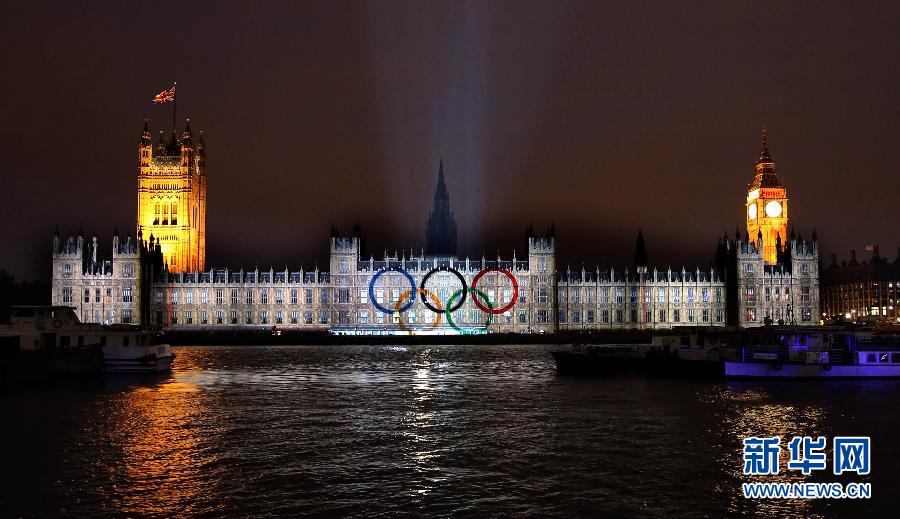 7月27日,第三十屆夏季奧林匹克運動會開幕式在倫敦奧林匹克公園主體育場“倫敦碗”舉行。這是開幕式當天,英國議會大廈的墻上打出奧運五環標志。新華社記者 凡軍 攝