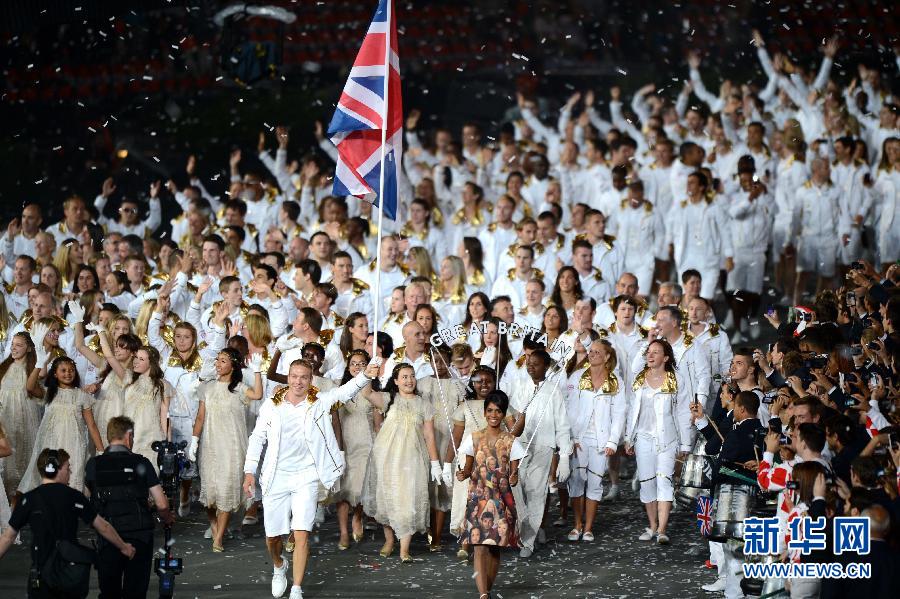 7月27日,第三十屆夏季奧林匹克運動會開幕式在倫敦奧林匹克公園主體育場“倫敦碗”舉行。這是英國代表團入場。7月27日,第三十屆夏季奧林匹克運動會開幕式在倫敦奧林匹克公園主體育場“倫敦碗”舉行。新華社記者楊磊攝