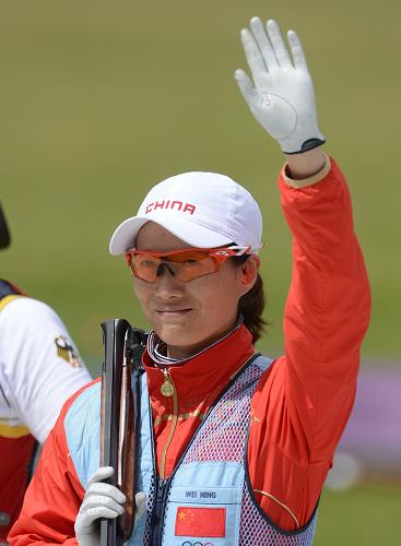 北京時(shí)間7月29日晚,倫敦奧運(yùn)會女子雙向飛碟決賽結(jié)束,來自山東煙臺的魏寧以91中的成績獲得銀牌,這也是她繼雅典奧運(yùn)會再次獲得該項(xiàng)目銀牌。美國老將羅德打出99中的成績,以絕對優(yōu)勢奪得金牌,并創(chuàng)造了奧運(yùn)會紀(jì)錄。斯洛伐克選手巴塔科娃以90中的成績奪得銅牌。新華社記者王慶欽攝