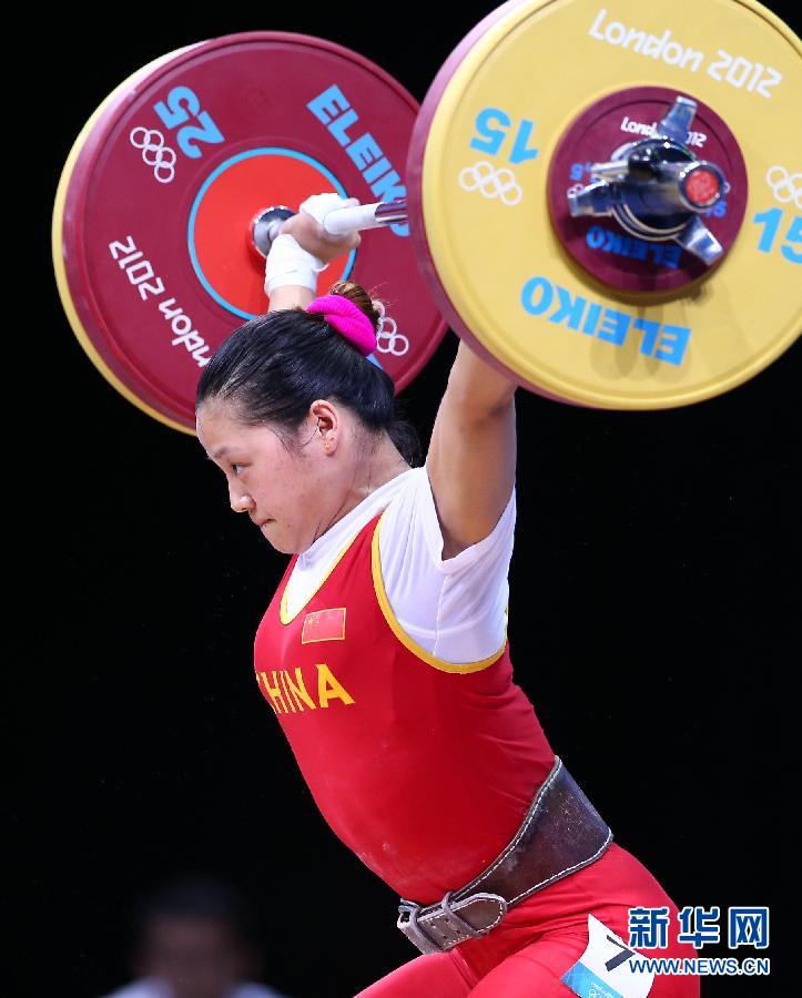 2012年7月30日,倫敦奧運會舉重比賽舉行女子58公斤級決賽李雪英為中國軍團摘得第八金。 圖為,中國選手李雪英在比賽中。新華社記者 陳建力 攝
