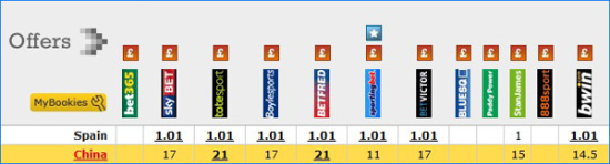 從賠率數據分析來看,西班牙本場優勢非常大,取勝的賠率甚至低至1.01,有部分公司竟然開出可笑的1.0的賠率,而中國取勝的賠率則相對離散,從最低的11倍的賠付到21都有開出,部分公司甚至開到67,本場中國取勝的可能很小,建議更多關注其他玩法。