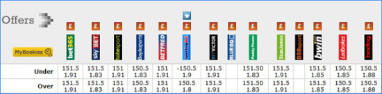 大小分玩法,莊家開到150.5居多,不過有兩家公司態度存在不小分歧,博天堂開出150.5分,大分低水1.80水位的盤口,而BETfair開出155.5分,大分高水的情況,本場比分在這個范圍內出現的幾率非常大,具體投注還要看賽程的開出情況。