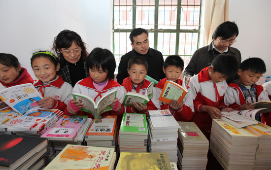 大眾網(wǎng)副總編輯姜長勇,山東人民出版社副總編輯丁莉,山東信誠人壽保險(xiǎn)公司宣傳主管張可等與明德小學(xué)學(xué)生共讀愛心書籍。(曹亮 攝)