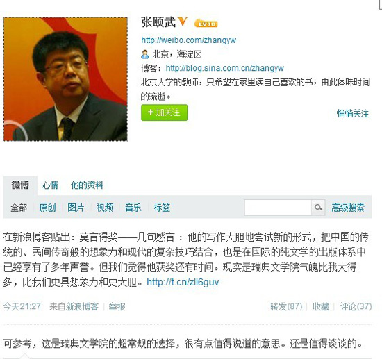 在個人實名認證微博中,張頤武說,莫言的寫作大膽地嘗試新的形式,把中國的傳統(tǒng)的、民間傳奇般的想象力和現(xiàn)代的復雜技巧結合,也是在國際的純文學的出版體系中已經(jīng)享有了多年聲譽。