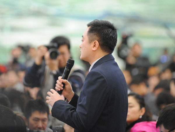 2012年3月4日上午11時(shí),十一屆全國(guó)人大五次會(huì)議在人民大會(huì)堂三樓金色大廳舉行新聞發(fā)布會(huì),由大會(huì)發(fā)言人李肇星就會(huì)議議程和人大工作相關(guān)的問題回答中外記者的提問。圖為中央電視臺(tái)記者在提問。王翰林 攝