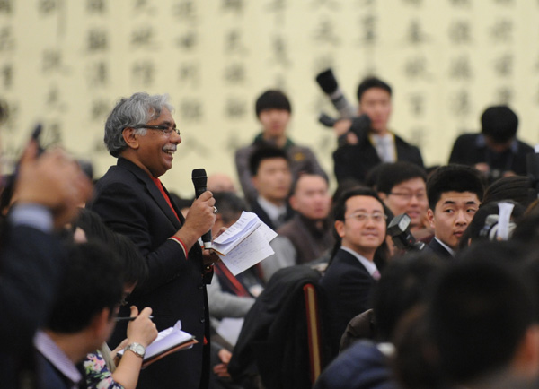 2012年3月4日上午11時,十一屆全國人大五次會議在人民大會堂三樓金色大廳舉行新聞發(fā)布會,由大會發(fā)言人李肇星就會議議程和人大工作相關(guān)的問題回答中外記者的提問。圖為巴基斯坦聯(lián)合通訊社記者提問。陳競超 攝