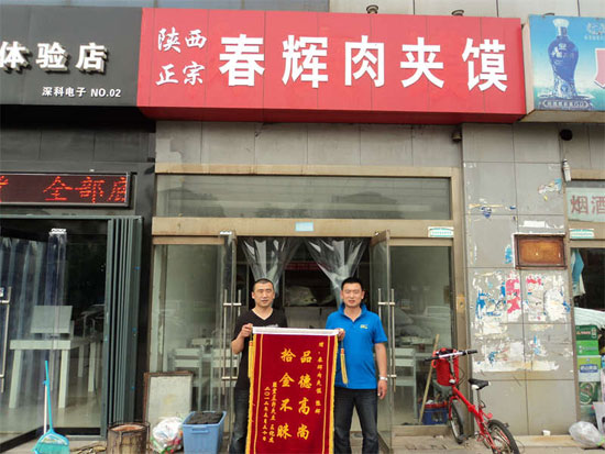 5月23日早上四點多鐘,住在勝宏辰軒的“春暉肉夾饃”老板張輝到車庫開車忙著去張羅店面生意時,突然發現旁邊車頂上有一個棕色錢包,找開一看內有4000余元現金及身份證、銀行卡等物品。當時天微微見亮,小區內寂靜一片,附近也并無一人,此時張輝急于處理店面事宜且無法及時與失主聯系,等物業前臺上班后,張輝急忙趕回辰軒小區請物業服務中心協助尋找失主,恰巧物業也曾接到過失主的救助咨詢電話。如此一來,物業服務中主很快幫忙聯系到了失主。看到自己的錢包能夠完璧歸趙,失主欣喜萬分,對張輝也是萬分感激。后失主將“拾金不昧 品德高尚”的錦旗和1000元現金送往張老板店里,表示自己的感激之情,張輝拒收了現金,笑著說:“這是我應該做的。”