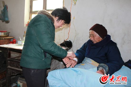 輸液后唐秀君給郭秀菊老人拔針。