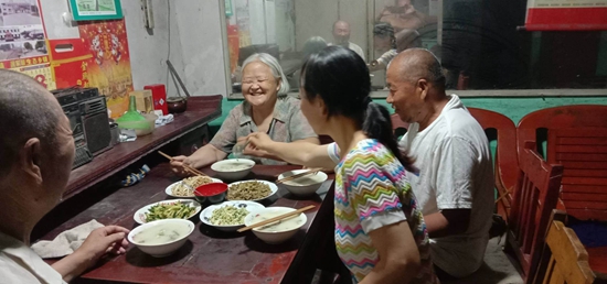 一日之計在于晨,清晨7點是張桂蓮一家人分享早餐的時刻,她家形成的慣例是:農活再忙也要及時讓老人吃上口熱氣騰騰的飯,老人在餐桌前坐下后,小輩們才能落座。讓張桂蓮欣慰的是,上初中的兒子非常懂事,積極地做些力所能及的家務……吃過早飯,張桂蓮便先把老人們帶到院子里曬太陽,再把茶杯遞到他們手里,然后來到叔公公宋賢云家中,幫他清理房間、換洗替換下來的衣物。如今,三位老人均已年過六旬,都是愛懷舊、愛嘮叨的老人家,張桂蓮總是不厭其煩、認真地耐心地傾聽,還經常順著老人的心思,陪老人們說說笑笑、解解悶。
