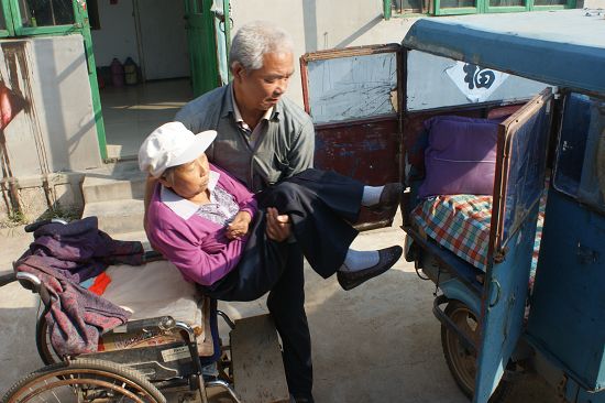 “桂枝25克,白藥25克,知母10克,防風10克,桑植30克… …”在郝玉孝泛黃的記事本上,記者從密密麻麻的字跡中讀到這行字,郝玉孝說,這是1990年他為妻子治類風濕時求來的藥方。一個巴掌大小的小本,寫滿了胡秀玲十多年來的患病情況及各種藥方,記錄了郝玉孝對妻子點點滴滴的愛,也鑒證了這對夫妻35的風雨相隨。12年來,去醫院的交通工具是郝玉孝精心“改裝”過的一輛三輪車,走近三輪車,外表破舊的車里面卻收拾得非常干凈,上下疊了五六層被褥。這輛三輪陪了他快十年了,為了給胡秀玲治病,郝玉孝跑遍了大江南北,湖北、濟南、南京等等都去了,光輪椅就用壞了4個。有時為了求一副藥,他要跑上幾十里路,路上餓了只能扛著,偏方沒少找,就是不管用!凹抑袩o病人,不見鬼和神!焙掠裥⑿χf,為了治好妻子的病,他想盡了一切辦法。1994年他聽說外縣有“神醫”,自己騎車就去了,早上3點出發,晚上9點回來,來回將近100里路。2001年到2005年期間,胡秀玲是去八分場醫院做透析,醫院對透析時間要求很嚴格,要求早晨6點準時到。為了不耽誤透析,郝玉孝總是提前幾個小時帶妻子上路,無論雨再急、雪再大,5年間從未遲到過。