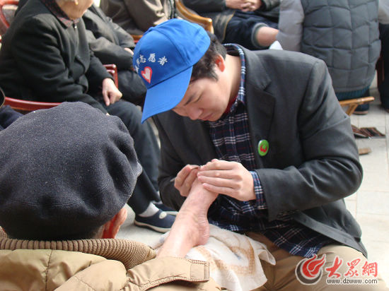 他給老大爺、老大娘按摩,一按摩就是45分鐘,夏天出一身汗,冬天飄一腦袋白煙。有老太太感嘆:“俺活了九十了,頭一回享這么個!薄2粫f不會道的高舉穩(wěn)必然憨厚地一笑,多給按摩一會兒。他給老人做足療和修腳,是最拿手的,他這方面不僅專業(yè),而且敬業(yè)。有些老人得了灰指甲已經(jīng)許多年了,雙腳的趾甲都是灰色厚厚的一層,隔老遠都能聞到一股味兒。高舉穩(wěn)毫不嫌棄,把老人的雙腳捧在懷里仔細觀察,有的老人還不好意思地要往回縮,高舉穩(wěn)怕老人緊張,就給老人把雙腿、雙腳敲敲揉揉按按,感覺到懷里那雙腿腳不再僵硬顫抖了,就掏出了修腳的工具細細修剪。他好像不知道臟,也不知道嫌棄,修完了腳的他長出一口氣,抖落著手上的趾甲渣,又繼續(xù)干活去了。高舉穩(wěn)雙手的關(guān)節(jié)處,全都是白亮亮的水泡。